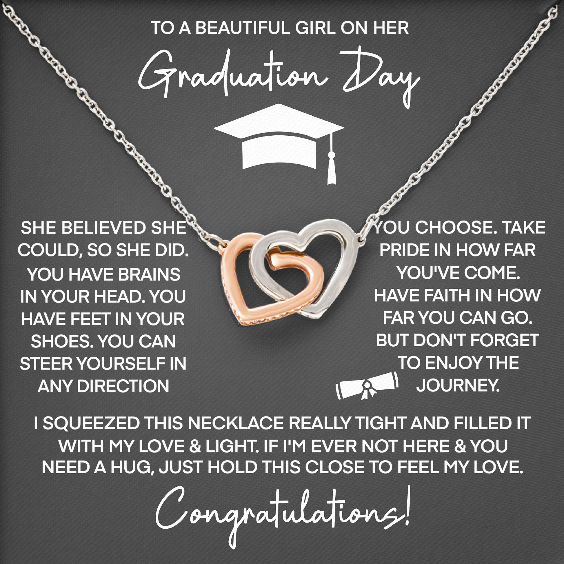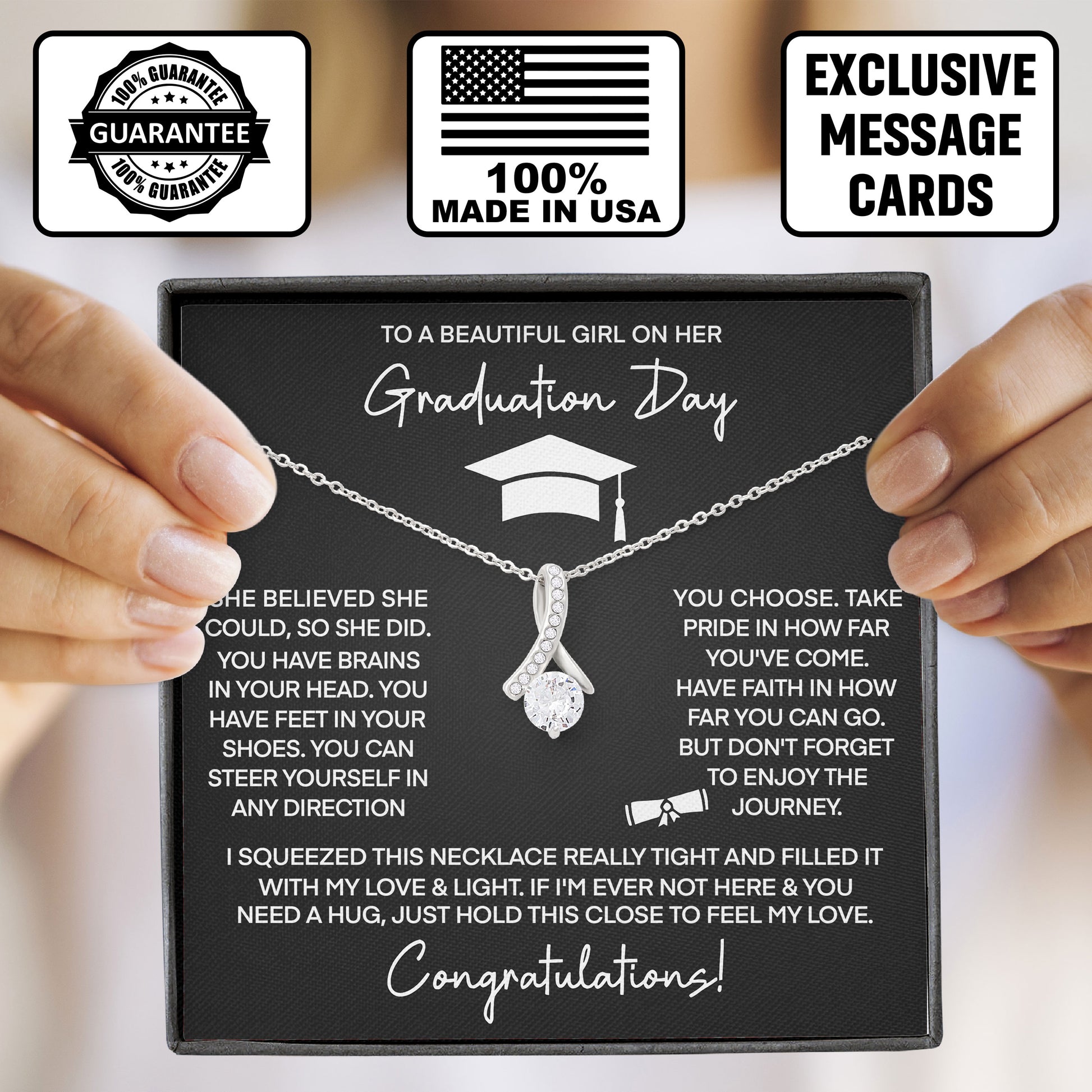 We purchased this beautiful necklace for our daughter’s graduation, and it was absolutely perfect. The packaging was elegant and thoughtful—the included message card truly touched our hearts. As soon as she read the heartfelt words, she was overcome with emotion. It made the moment incredibly special. The cubic zirconia pendant has a lovely sparkle, and the design is both delicate and timeless—something she can wear for years to come.